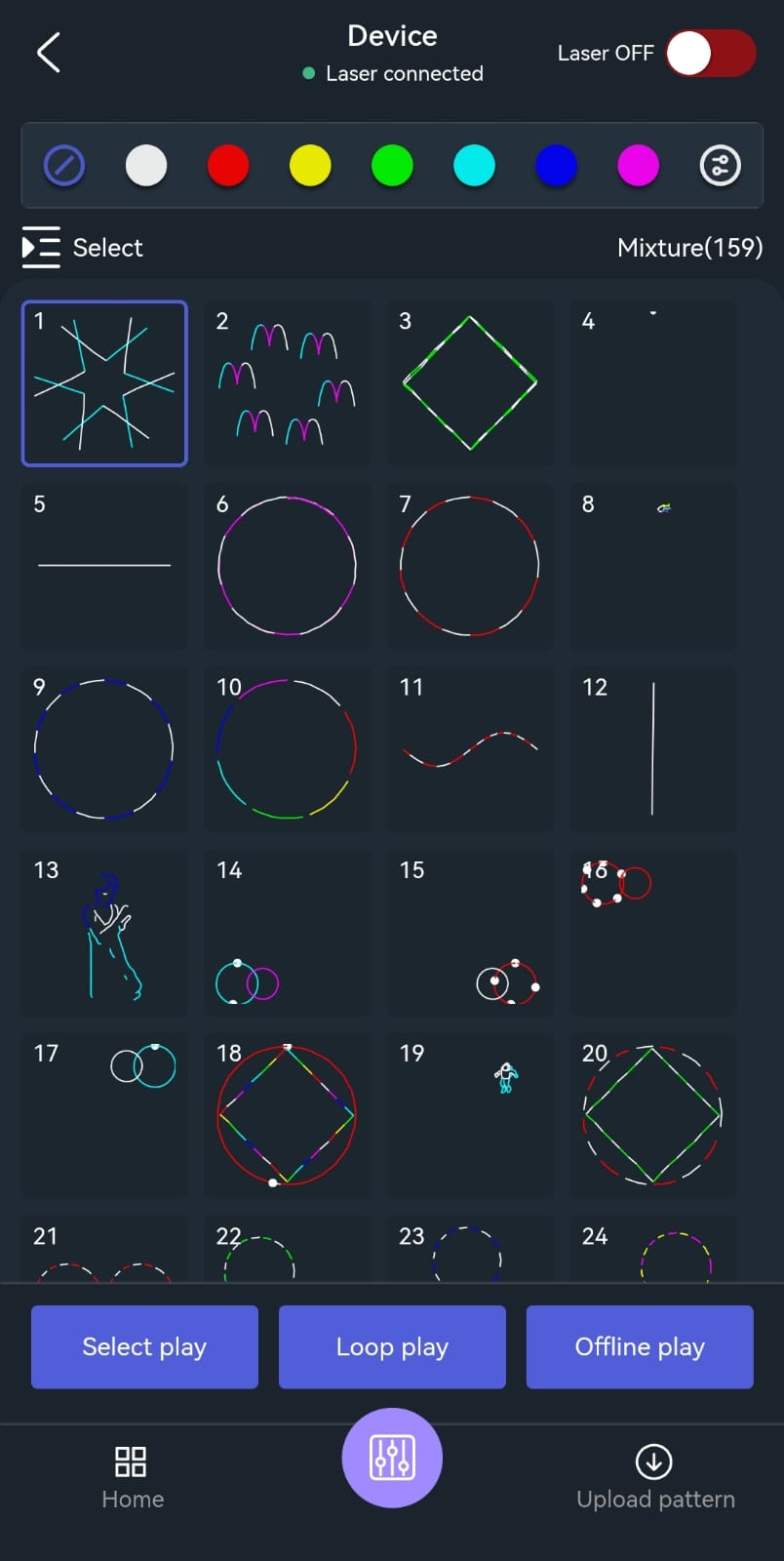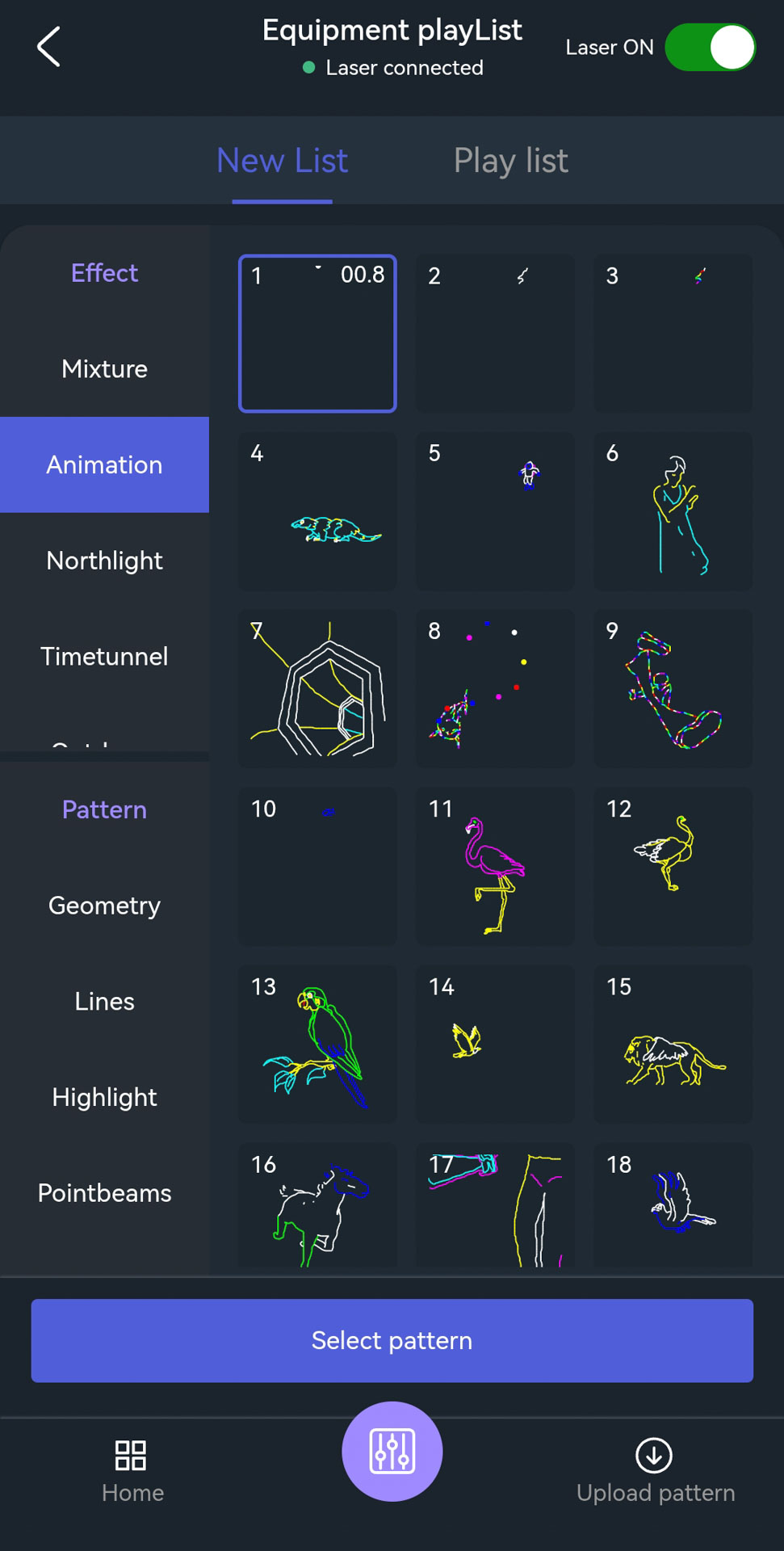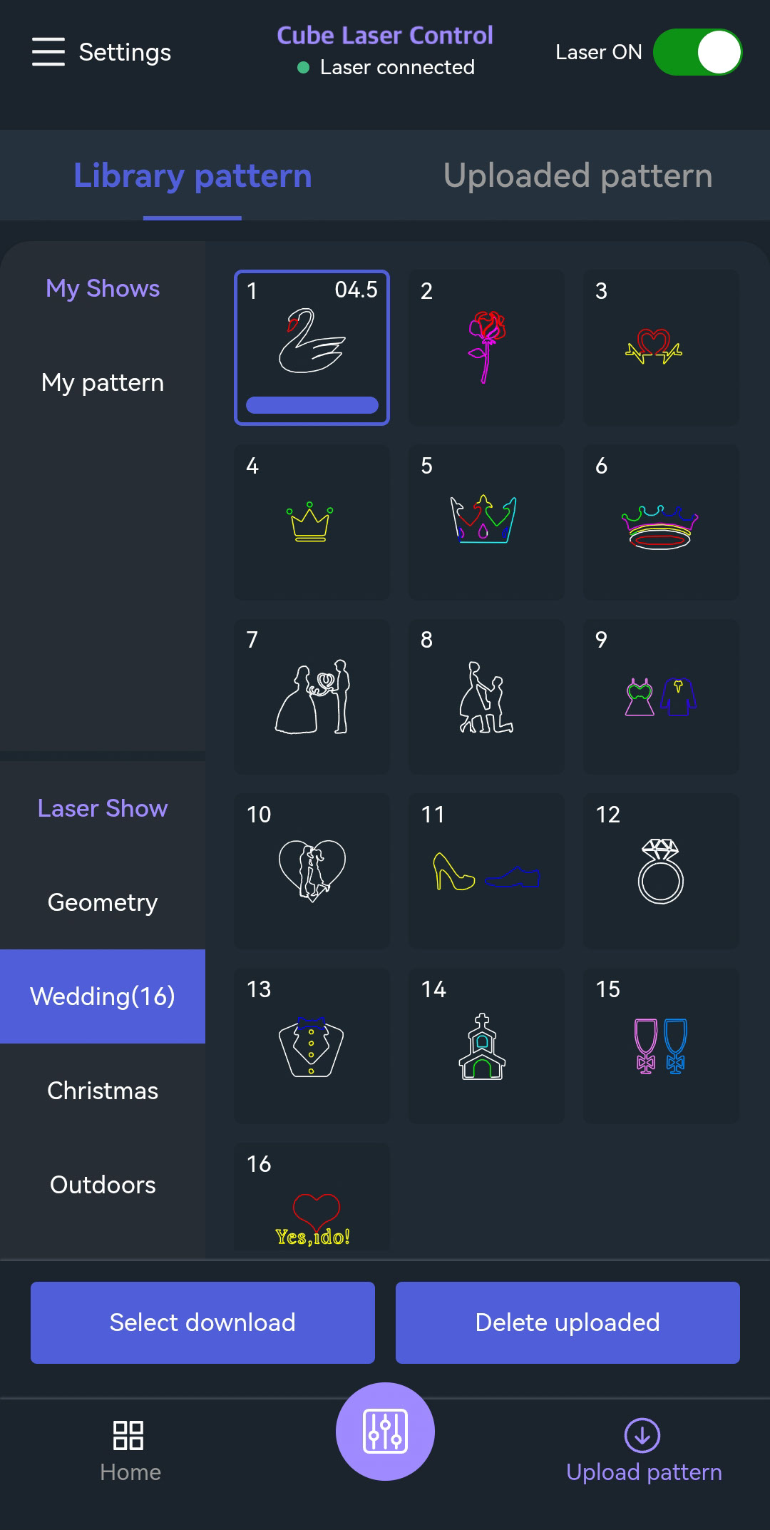Individual patterns can be selected and uploaded from the app to the laser system.