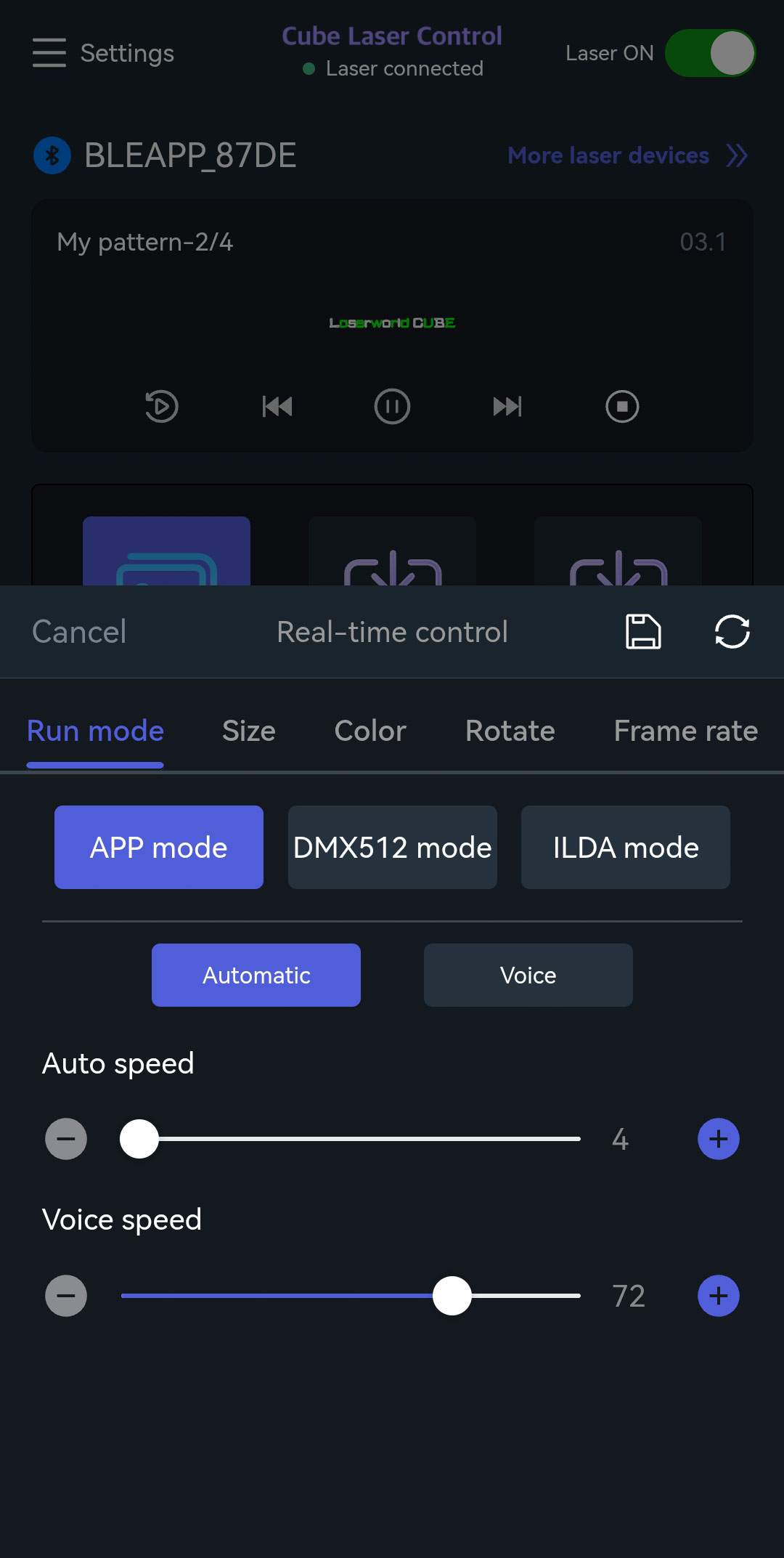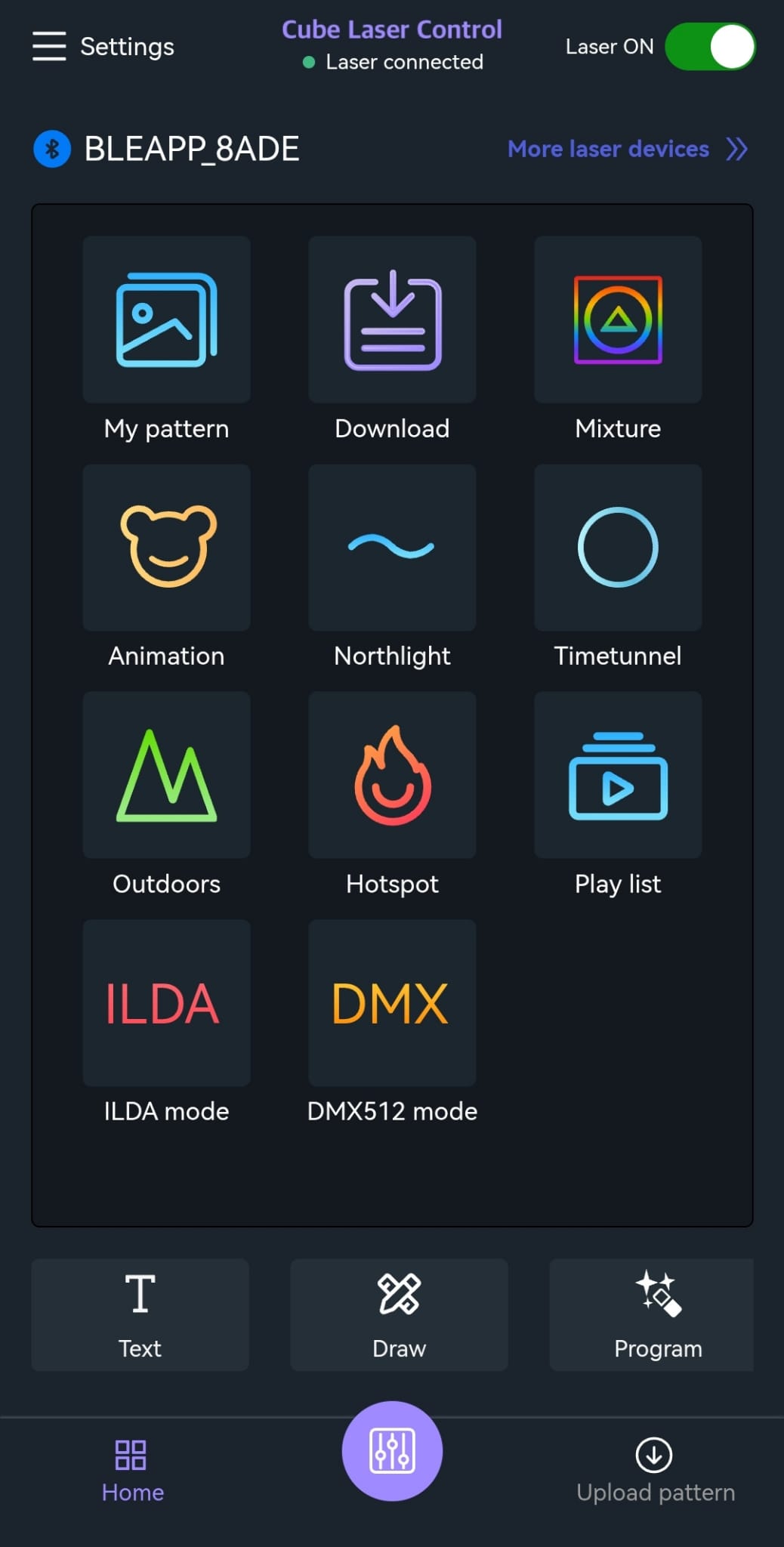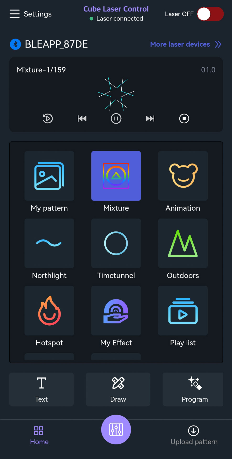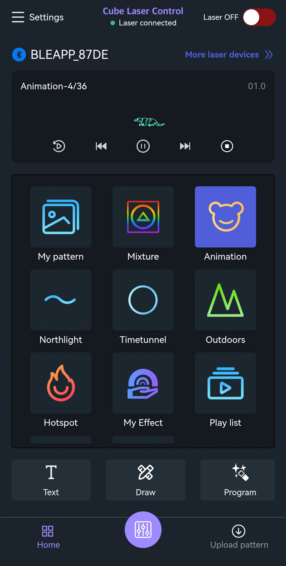 Individual patterns can be selected and uploaded from the app to the laser system.