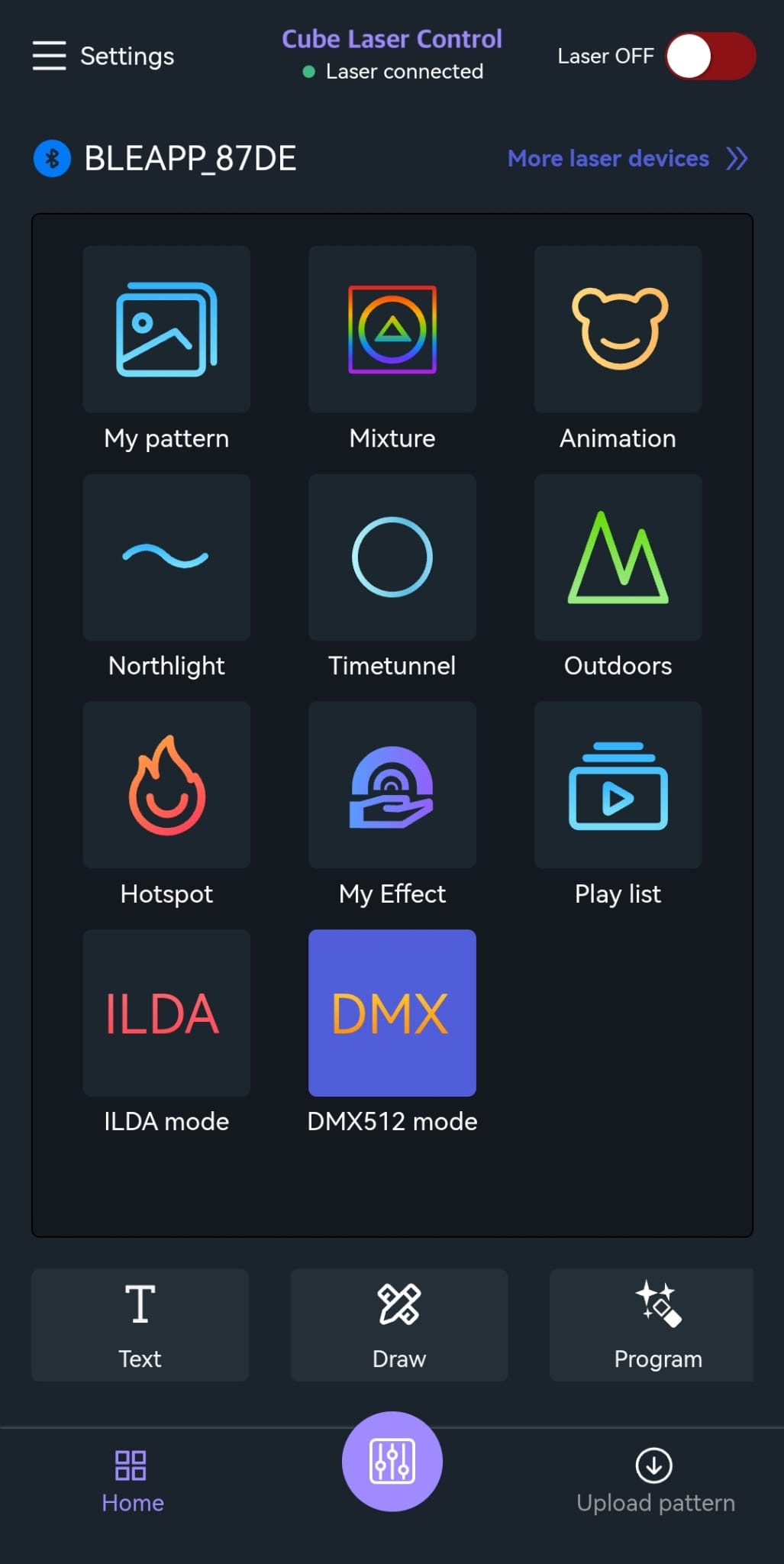 In DMX mode, the laser can be controlled via an external DMX console. There are two ways to activate DMX control within the app.