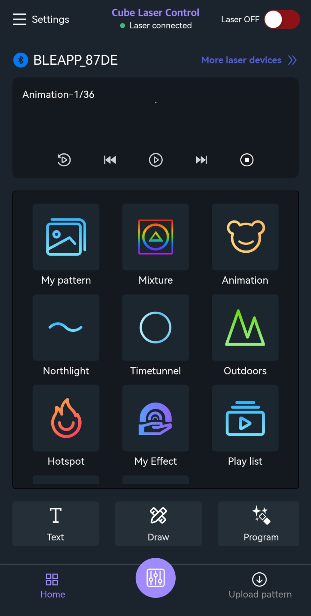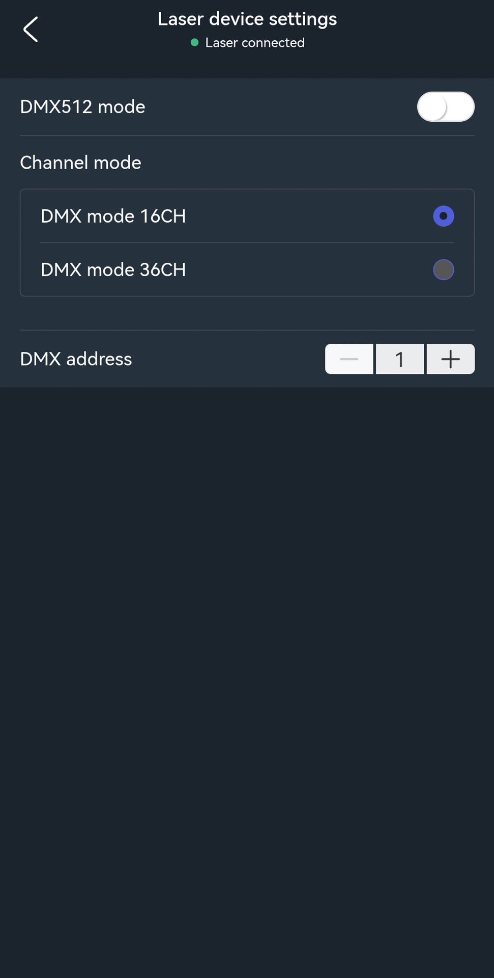- After switching, the app’s internal control is disabled and the laser listens to the DMX control signal.
