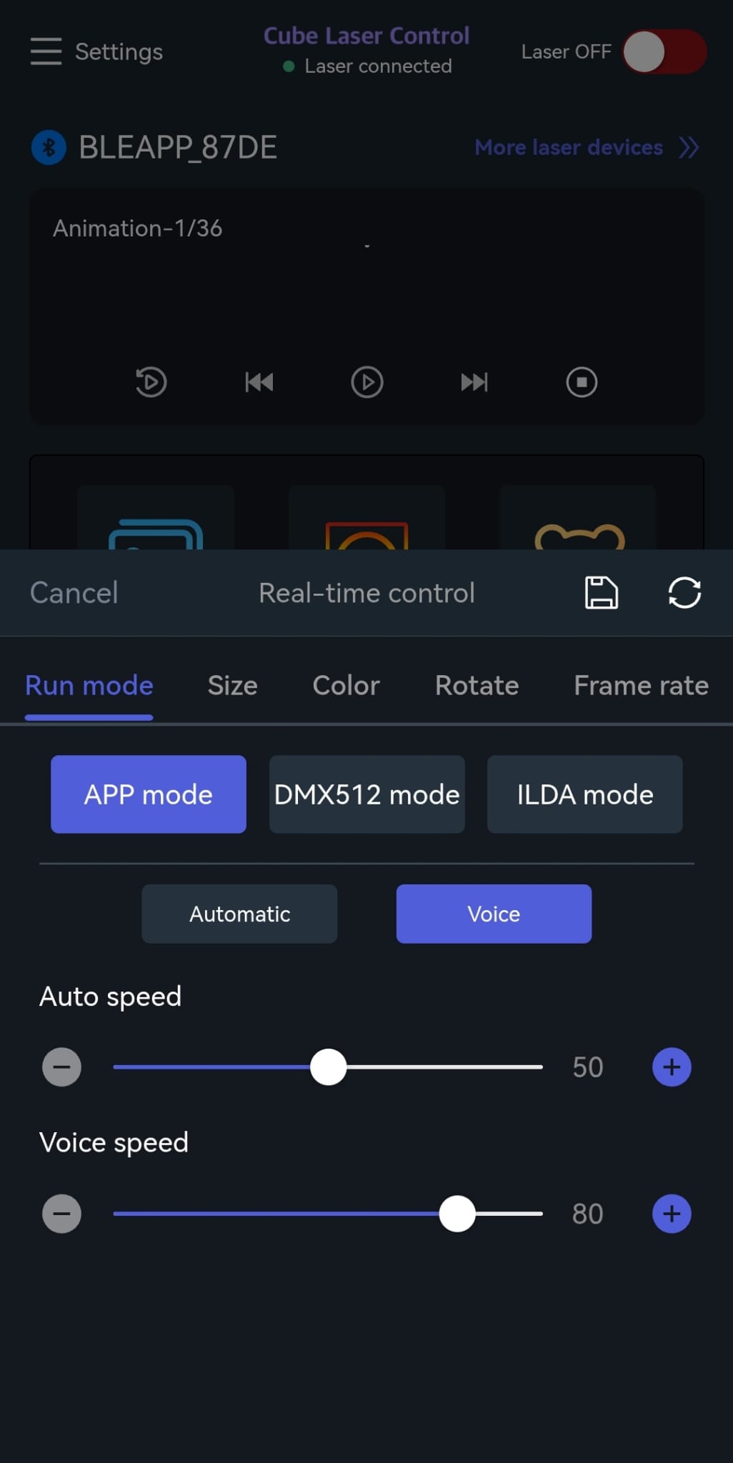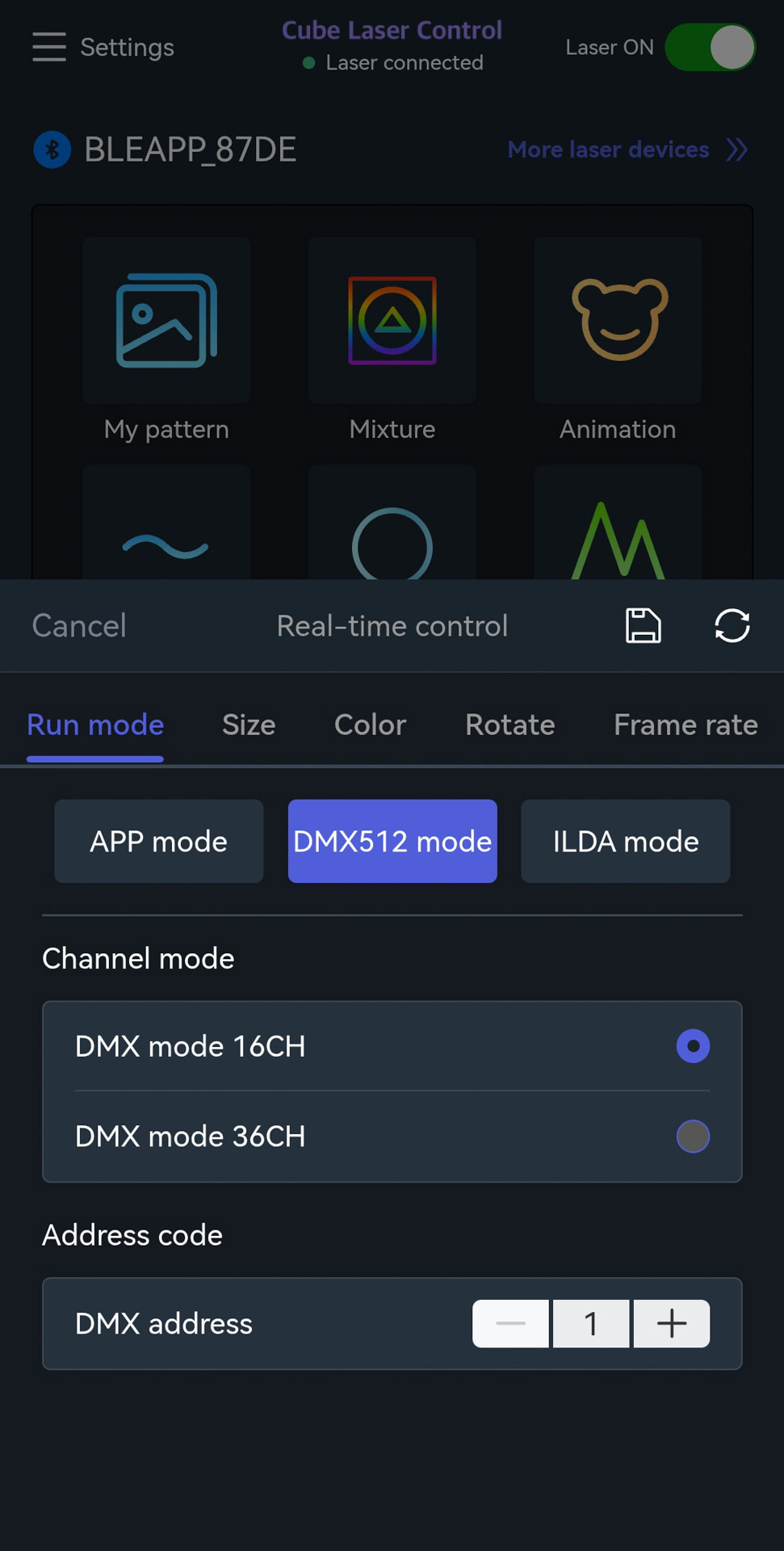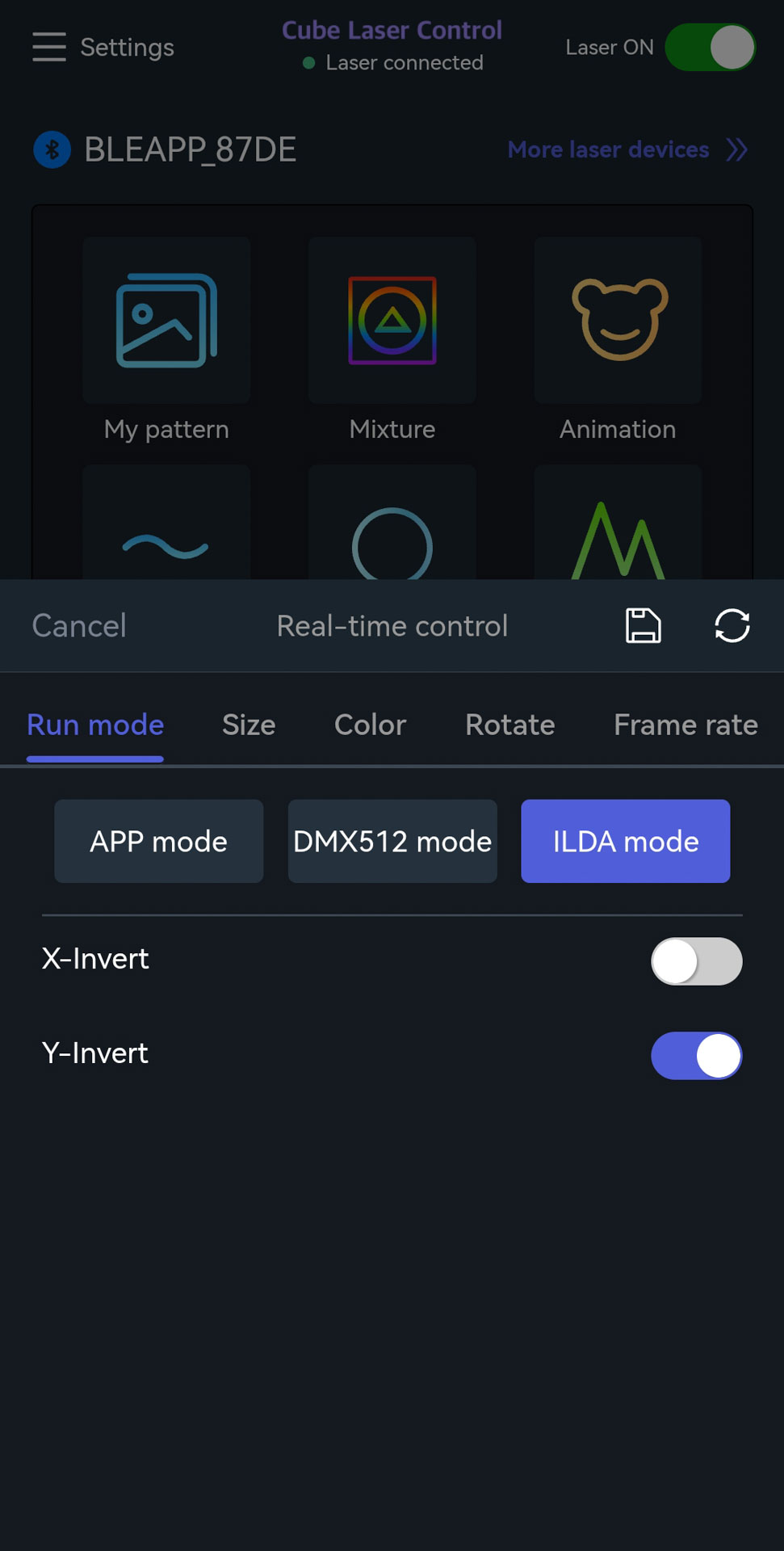 - Switch to ILDA mode in the app (same procedure as switching to DMX mode)